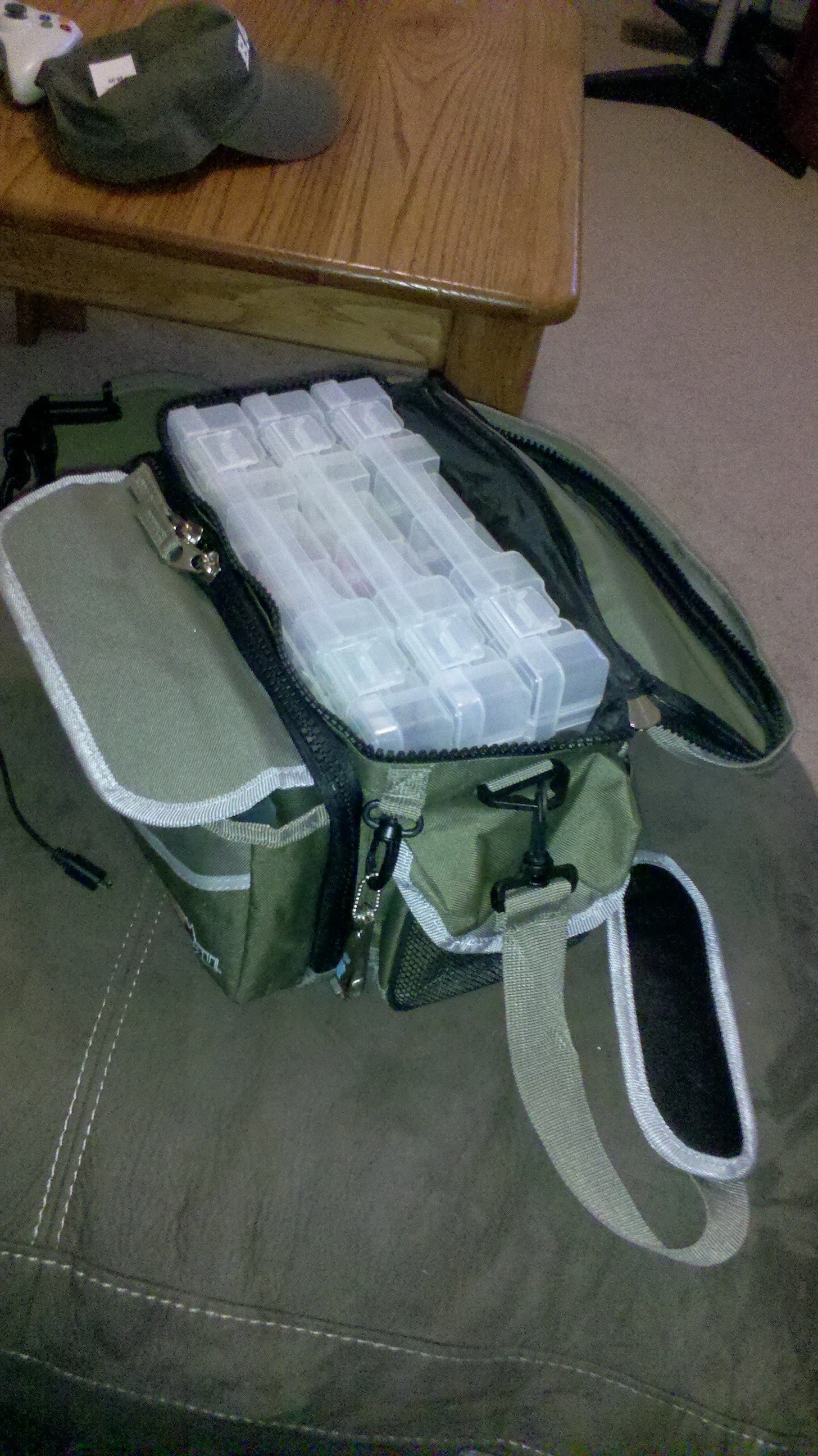 For Christmas 2011, I asked Santa to upgrade my plastic tackle box to a canvas tackle bag. He didn’t bring me one, but he did give me a gift card for Gander Mountain and asked me to pick out my own. Given the small amount of lures and baits I had at the time, this is what I picked out: