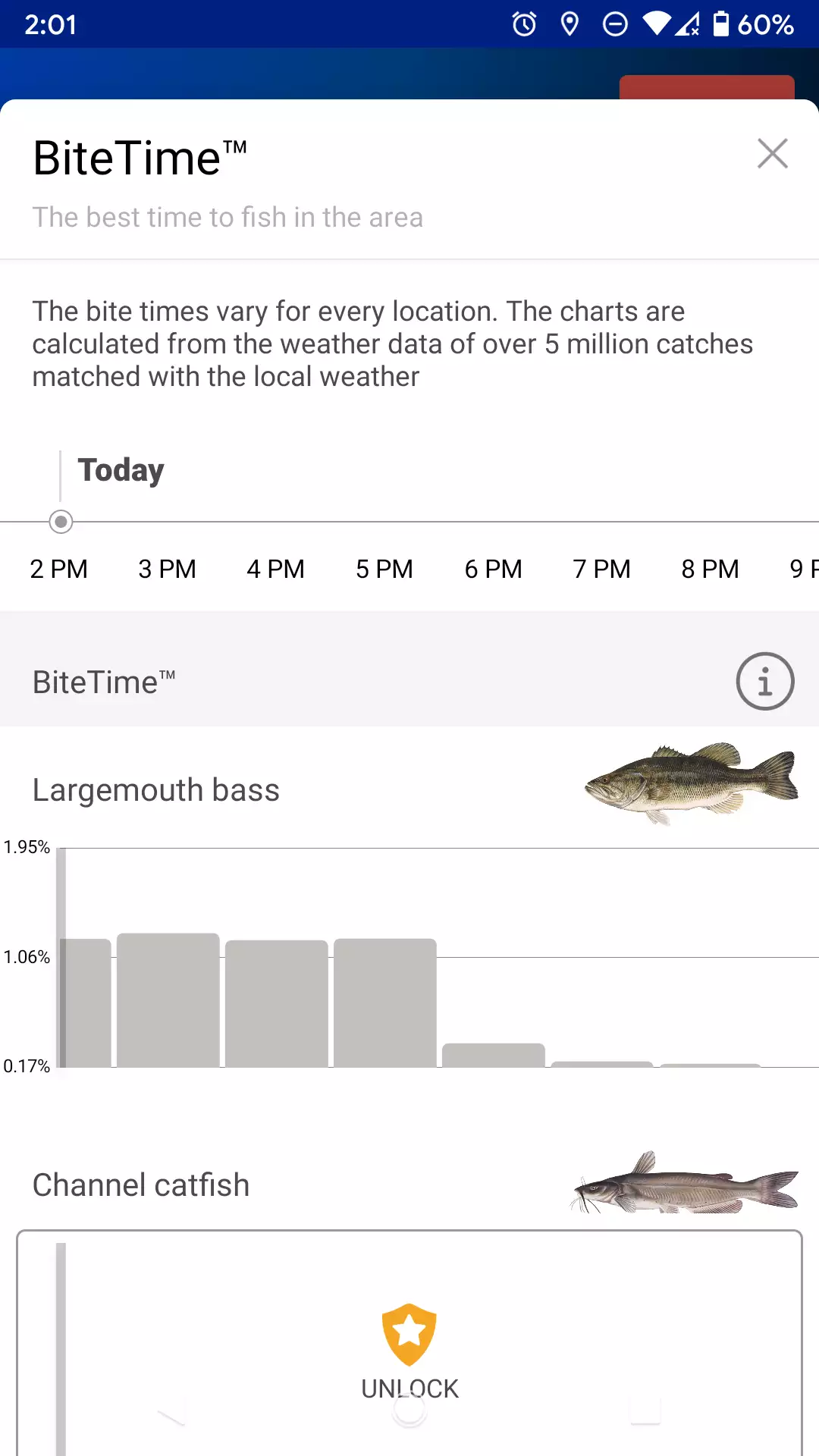 As you might have guessed, BiteTime™ shows you a breakdown by hour of all of the species in the area or the water. This feature shows all species for Pro members, but for Basic members, it only shows you the top 1 species.