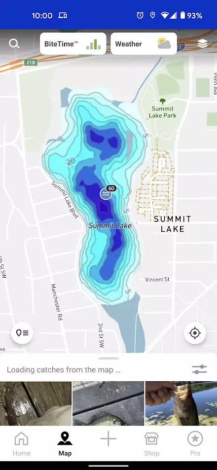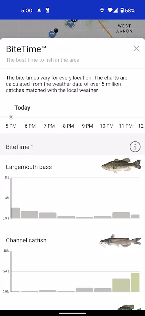Another Fishbrain app feature is the ultimate fishing forecast called BiteTime™. The BiteTime™ feature shows you the best times of the day to catch fish. When you are in the interactive map, there is a button for BiteTime™ on the top of the map. This will show you the best bite times in the area shown in your map. If you are in a specific water, BiteTime™ shows at the bottom of the the Forecast tab.