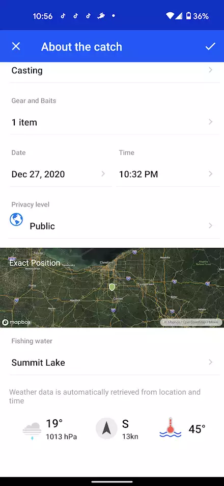 After catching a fish in a fishing spot you discovered using the interactive map, you have the opportunity to log that catch and share it with others.