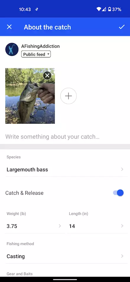 - a selfie of you and your lunker, including taking a photo from within the app or selecting an existing photo