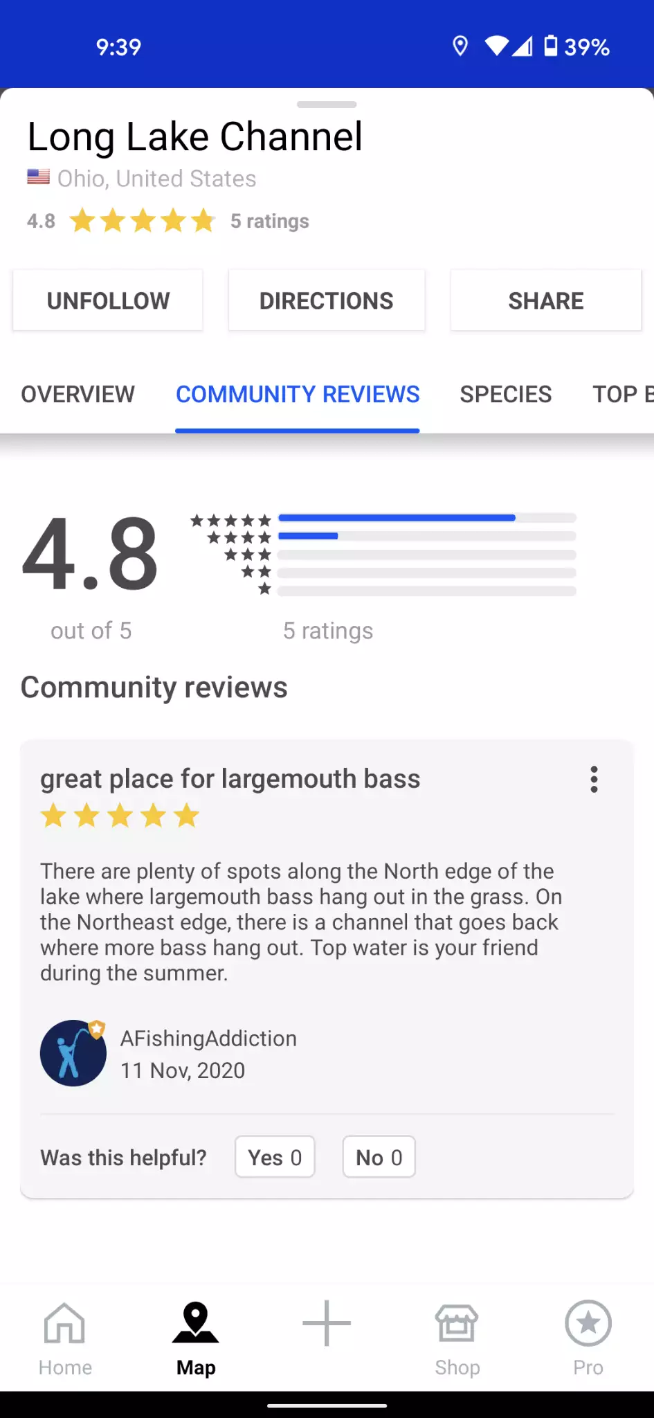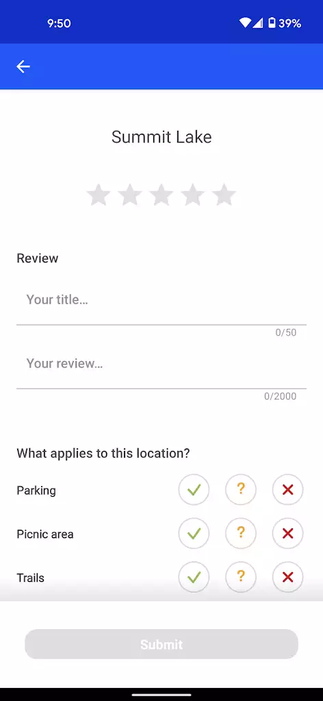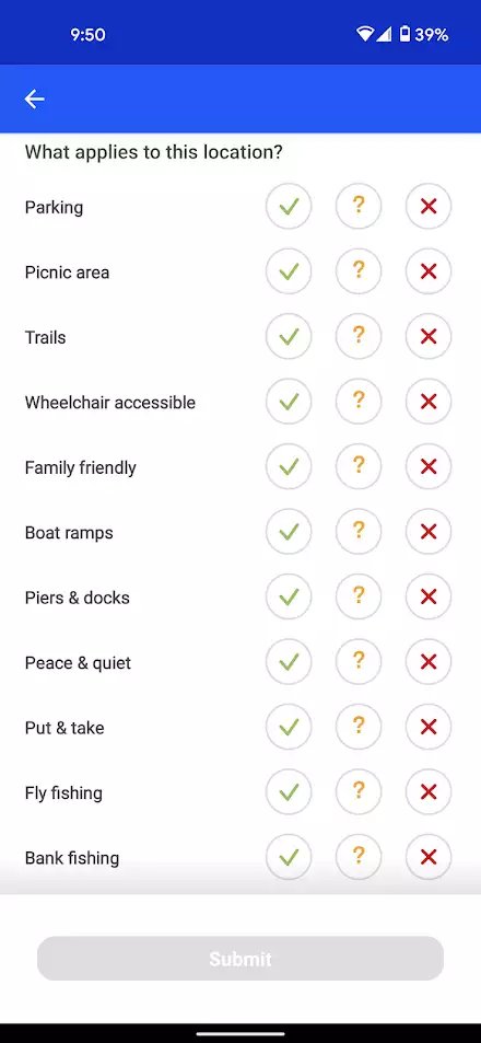 I encourage you to submit your own ratings and reviews for the locations you visit. This helps build a community by providing value to others. When submitting a review, you have the opportunity to give a 1-5 star rating, give your review a title, and a max 2000 character review of the water. In addition, the Fishbrain app also asks what features are applicable to the location. This is answered with a simple tap on the checkmark (yes), the question mark (unsure), or the red X (no).