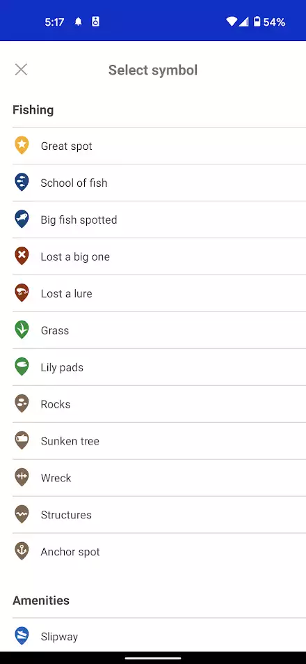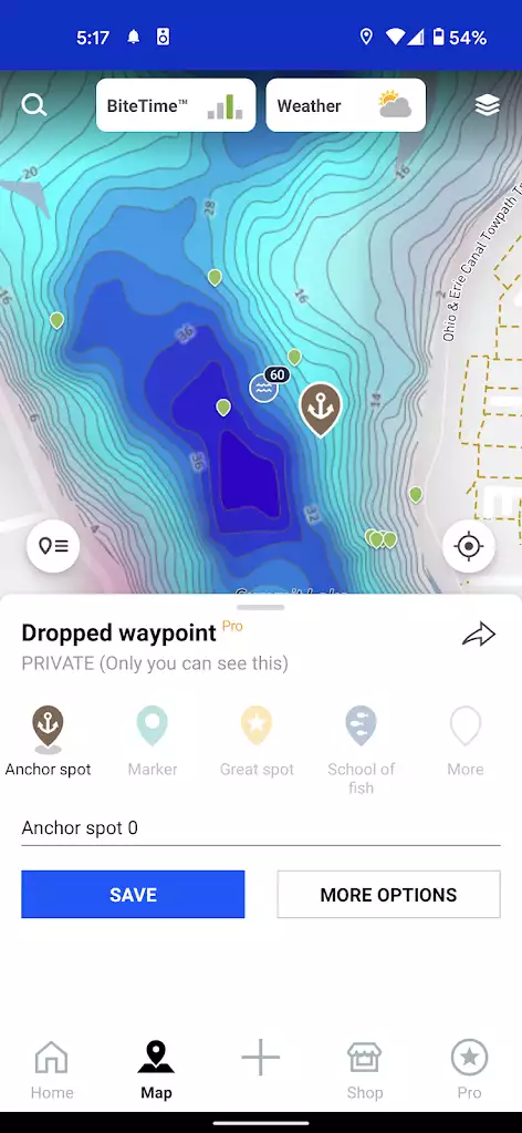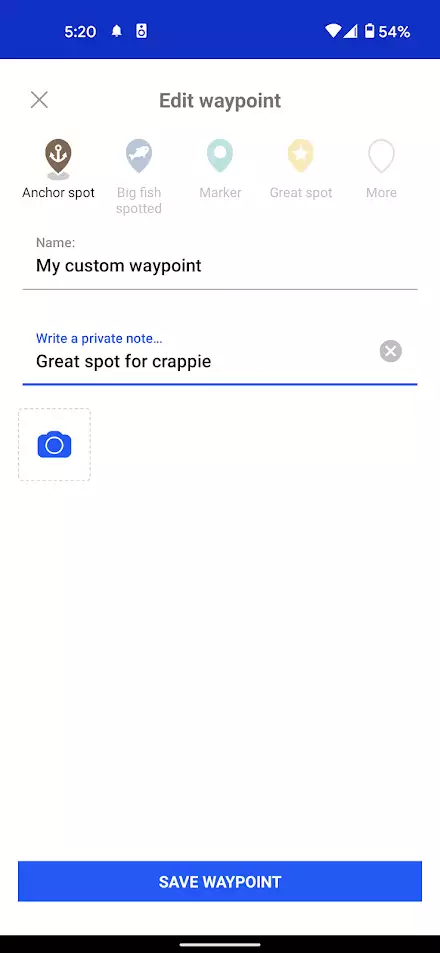 The Fishbrain Pro membership also activates the private waypoints feature. This feature allows you to create custom markers on the map that are saved to your account. You can choose from lots of symbols to mark your waypoint. You can also name your waypoint, add a note, and upload an image to your waypoint. The uploaded image would help you identify the spot again in the future by capturing any unique structure or tree.