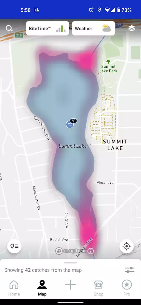 As of the writing of this article (December 27, 2020), this feature is in Beta and is only available to Pro members. This feature highlights spots that might be good for fishing. This feature is also only available in certain states—21 to be exact. Enabling this feature shows a pink heatmap overlay on the interactive map. The darker the pink, the more prominant the prediction. However, this feature is in Beta and may or may not be reliable.