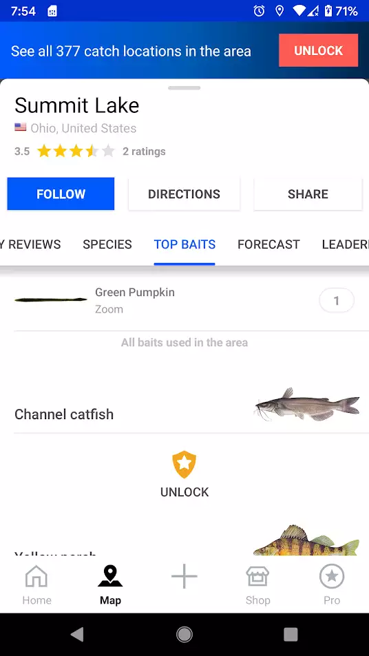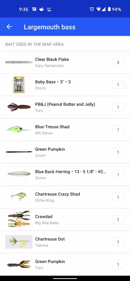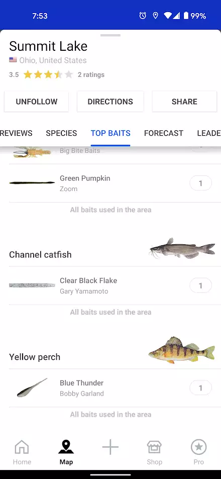From the individual water view, the Fishbrain app shows you the best baits and lures for each species, including a count of the number of times a bait was recorded. The baits are recorded over time from the logged catches from you and other anglers. This feature is available for both Pro and Basic members, but it is limited to the top 1 species for the Basic membership.