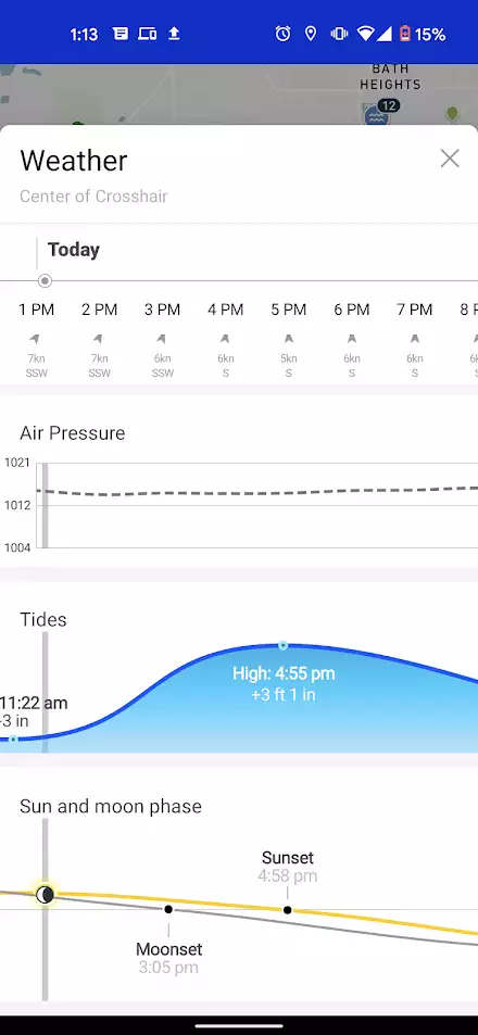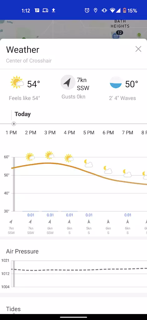 Another unique feature of the Fishbrain app is the weather forecast. For convenience, you can get the weather forecast right from the interactive map or while you are viewing a specific water. The current weather details include current temperature, wind speed and direction, and wave height. The weather forecast can be viewed by the hour and provides temperature and cloud coverage, precipitation, wind speed and direction, air pressure, tides, and sun and moon phases.